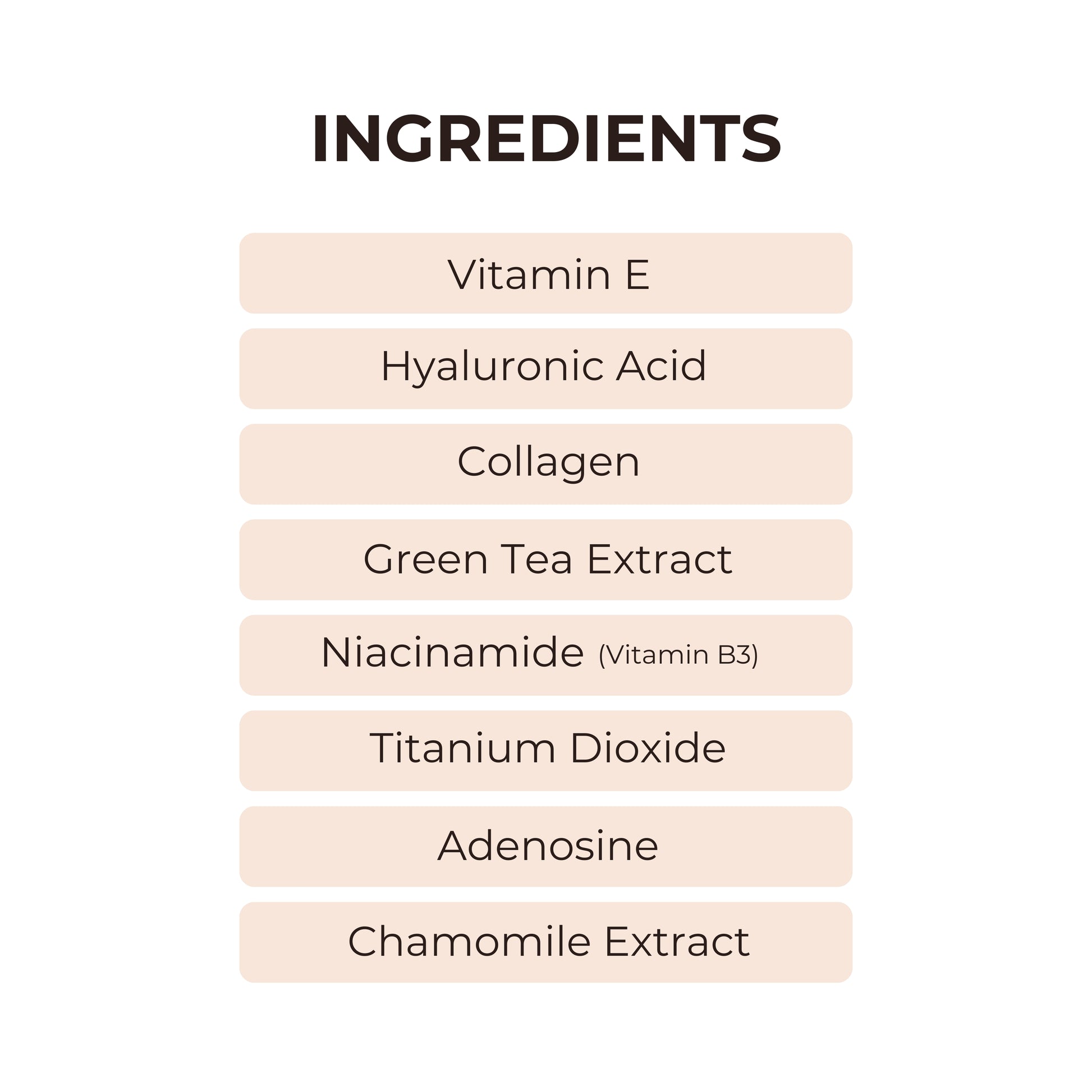 - Enriched with - Vitamin E for anti-aging benefits Hyaluronic acid for hydration, protection and filling wrinkles.